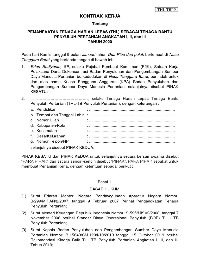 Kontrak Kerja Thltbpp 2020 Thl Pdf